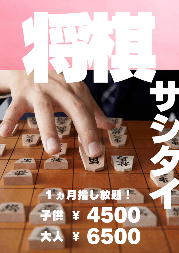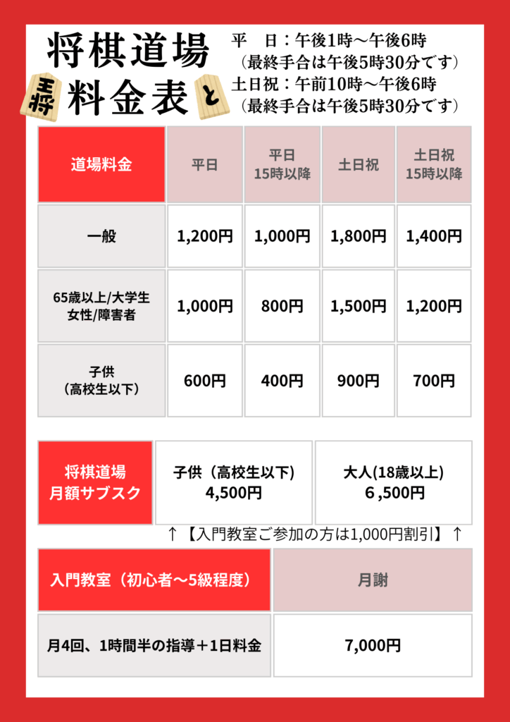 【将棋道場1ヵ月指し放題プラン】利用時間:平日:13:00~18:00 土日祝:10:00~18:00、料金:子供(高校生以下)4,500円、大人(18歳以上)6,500円【入門教室ご参加の方は1,000円割引】