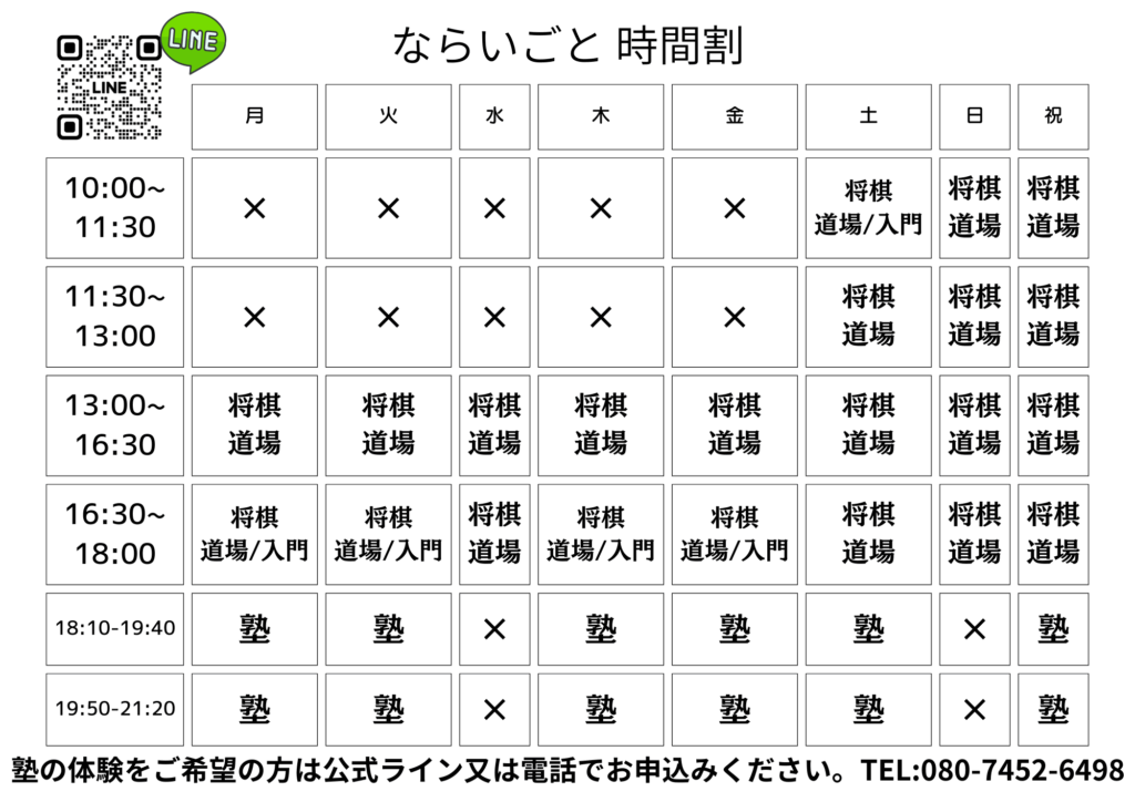 | 将棋道場 営業時間 | 月:13:00-18:00 火:13:00-18:00 水:13:00-18:00 木:13:00-18:00 金:13:00-18:00 土:10:00-18:00 日:10:00-18:00 祝:10:00-18:00 |